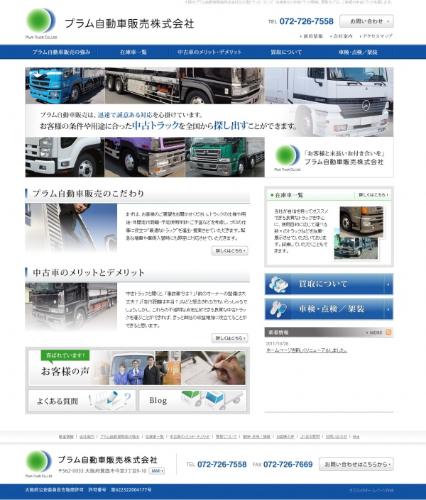 大阪のプラム自動車販売株式会社は、大型トラック、ダンプ、冷凍車など中古トラック販売から買取まで、中古トラックのプロです。 ご希望の中古トラックを探しますので、お気軽にお問い合わせください。 |
